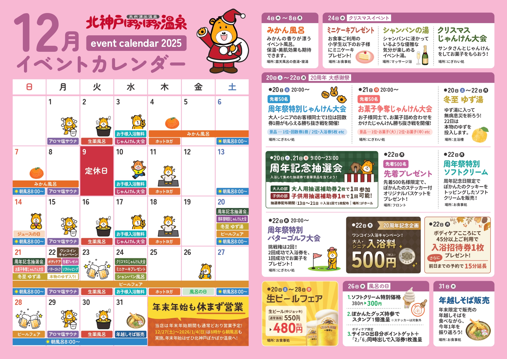 2025.11.28 12月 カレンダー 「おかげさまで20周年を迎えることができました。これまで支えてくださった皆さまに心より感謝申し上げます。これからも変わらぬご愛顧とご指導を賜りますようお願い申し上げます。」 周年祭は、大抽選会を開催します。 抽選会の参加には、12/13~12/21配布の補助券が必要になります。 大人:補助券2枚で1回抽選 参加可能 子供:補助券1枚で1回抽選 参加可能 ※子供さんは子供用抽選になります。 12/20~12/2 20周年 大感謝祭 抽選会